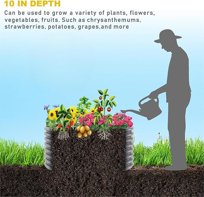 - 【Durable Galvanized Steel Construction】:Crafted with high-quality galvanized steel, this metal raised garden bed is built to last. The anti-corrosion coating ensures long-term durability, while the sturdy structure withstands heavy soil and weather conditions, making it perfect for outdoor use. Unlike traditional wooden garden beds, it resists warping and rotting over time.
