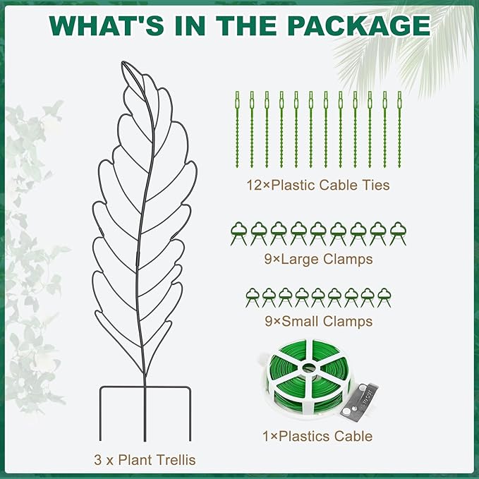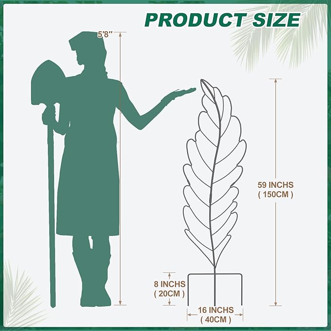 • Optimal Size for Various Spaces: Measuring 59"H x 16"W, our leaf-shaped plant trellis is the perfect size for both indoor and outdoor placement. Its design ensures that your climbing plants receive the support they need to grow healthily and beautifully