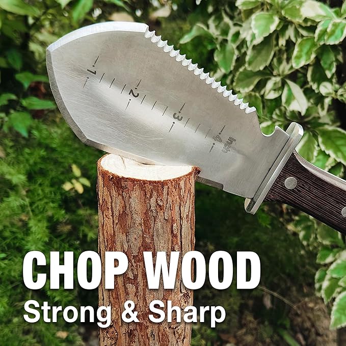 • Efficient & Versatile: Ideal for fast digging, weeding, and cutting. Serrated edge cuts ropes, woven bags, and plant roots, while sharp edge cuts through small branches.