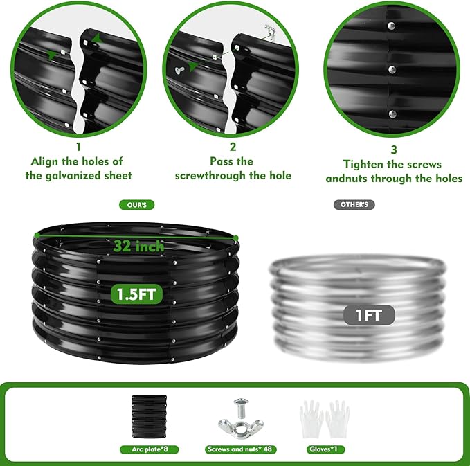 • Materials and Construction: The raised garden bed kit is constructed with sturdy metal 0.8mm thick, providing a reliable framework for your garden.The round-shaped design adds a unique aesthetic,and the 17" height provides ample depth for plants