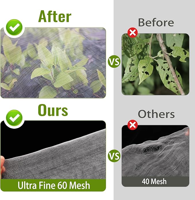 • Ultra Fine Mesh Netting: Constructed of super dense 60 mesh (0.8 mm x 1 mm), plant cover will protect your vegetable and fruit trees away from animals eating like birds, squirrels, rabbits, help you have more and tastier fruits