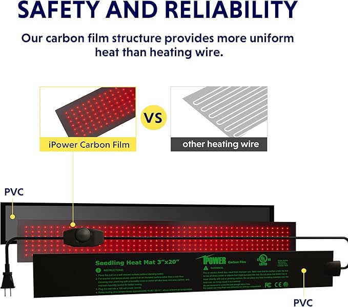 • Heating film structure: heating film ensure uniform heating. Warms root area 10-20℉ (5-11℃) over the ambient air temperature, which will increase the success of seedlings and cuttings