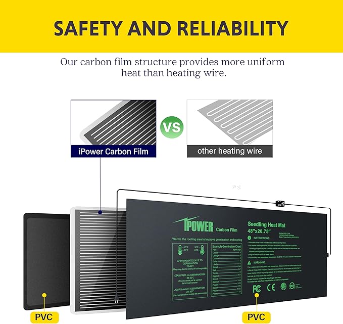 • Heating film structure: heating film ensure uniform heating. Warms root area 10-20℉(5-11℃) over the ambient air temperature, which will increase the success of seedlings and cuttings