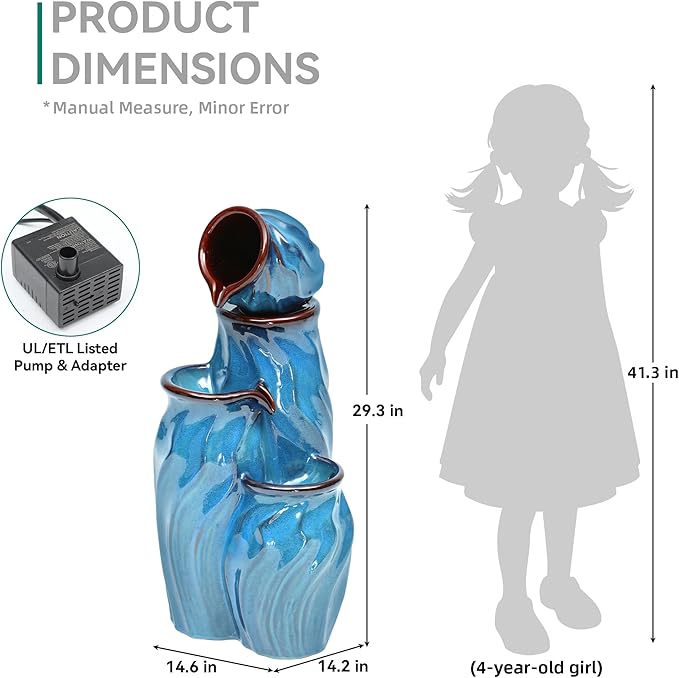 - EASY & SAFE USE: Equipped with an upgraded ETL/UL-Listed pump, 6ft standard power cord, easy to blend with any outdoor setting, just add water, plug-in and enjoy with 1-year manufacturerโs warranty. Warm Tips: During freezing temperatures, please drain the fountain, disconnect the pump, and store indoors.