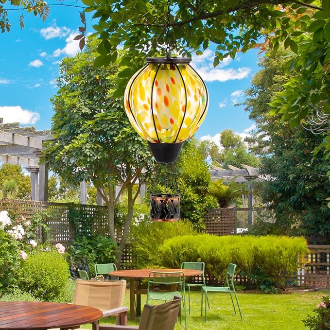 - Hot Air Balloon Decor: YELENEW yellow solar hot air balloon lanterns is made of thick glass and a realistic flame lights;solar hot air balloon flickering flame hanging garden light is a brightly colored ornament during the day,When the sun goes down,The flickering flame effect is like a real hot air balloon,making it an excellent garden decoration