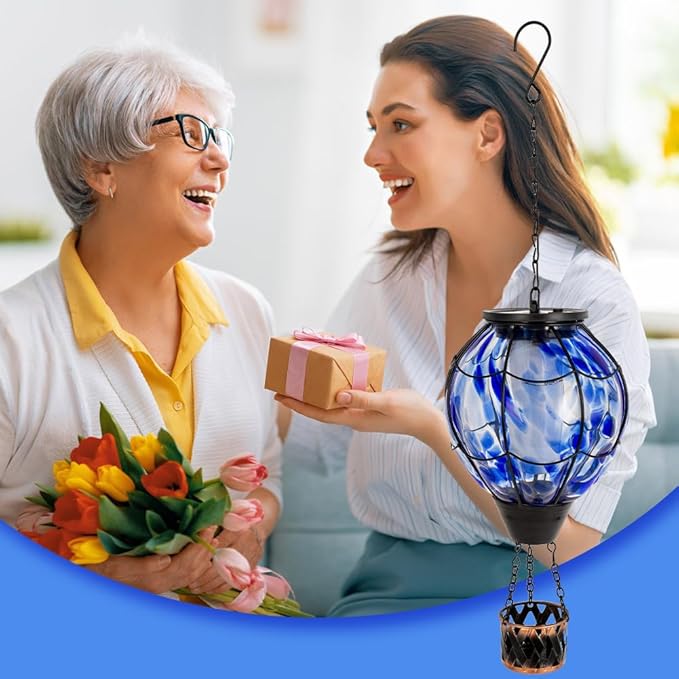 2PCS Solar Hot Air Balloon Lantern with Flickering Flame,Blue Glass Hot Air Balloon Solar Lanterns Outdoor Waterproof Hanging Decorative Light for Patio Porch Yard,Garden Gifts for Women