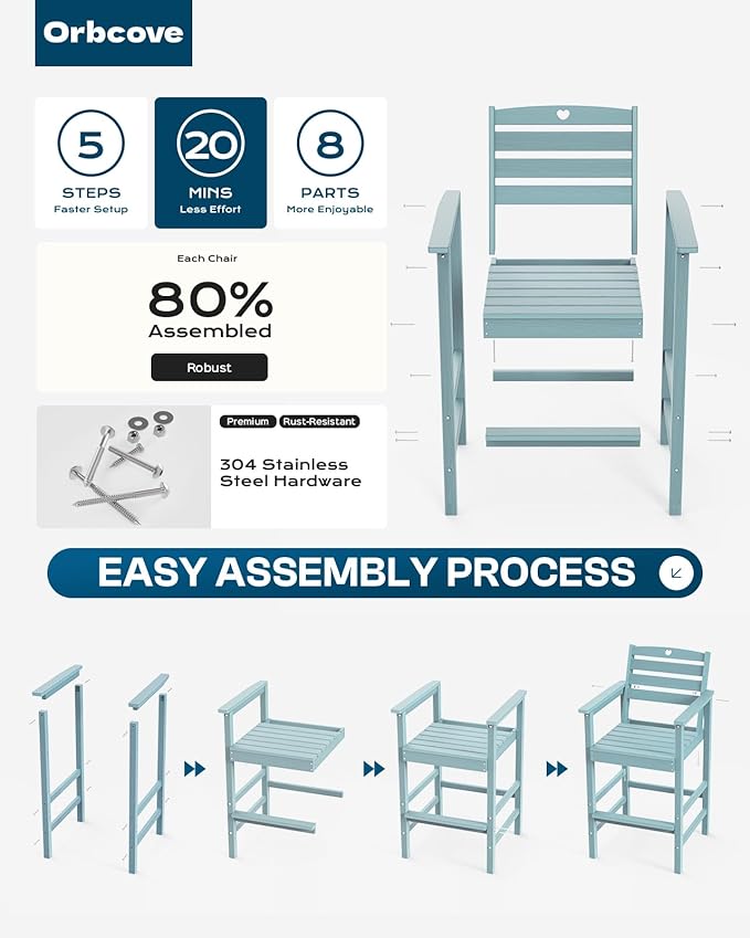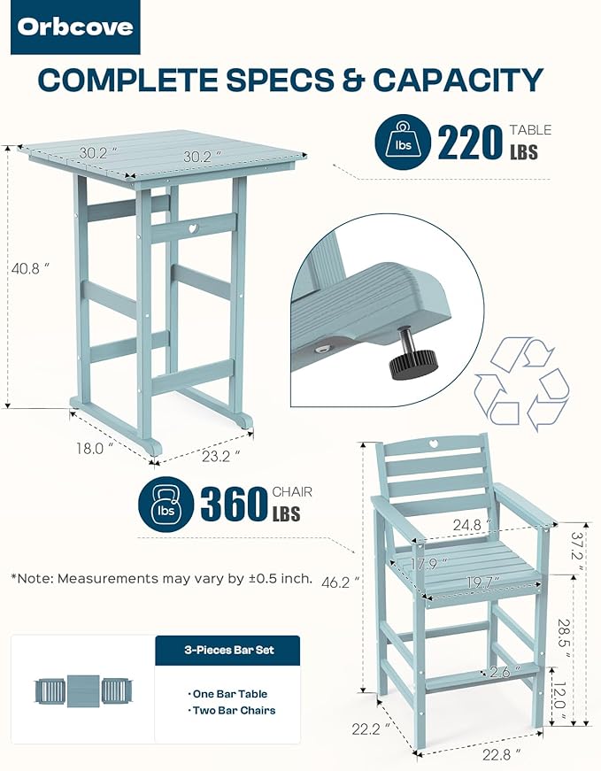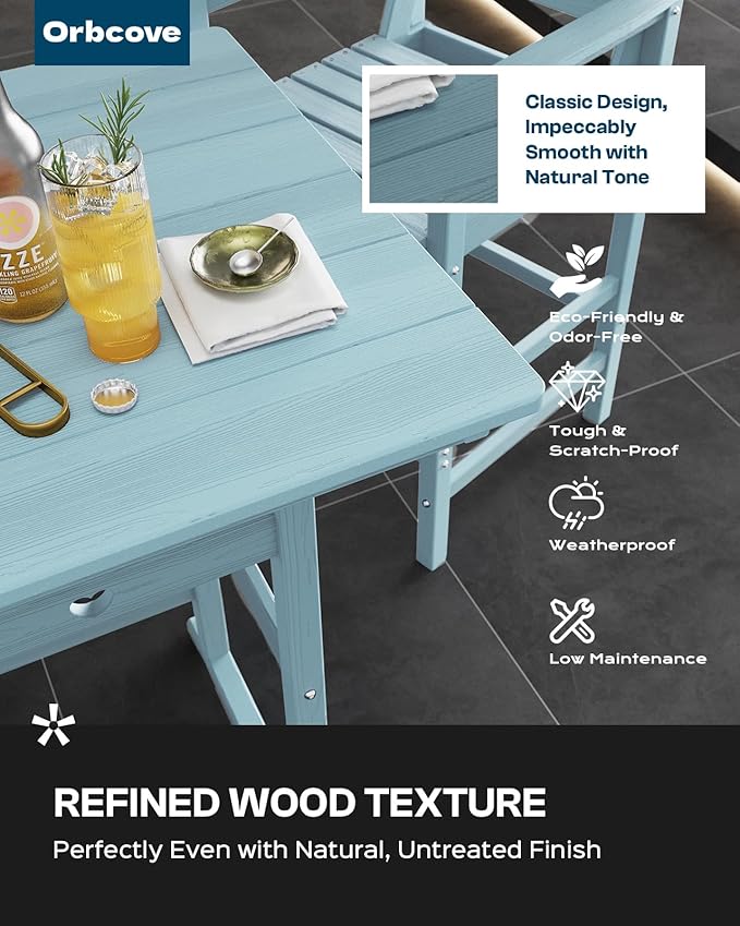 - Durable All-Weather Design: (Please note!!!Your order consists of two separate packages, which may be delivered at different times.) Crafted from HDPE with a natural wood grain finish, Orbcove bar table and chairs set withstands sun, rain, and wind without fading or cracking. Ideal for deck furniture, backyard furniture, or porch furniture, itโs perfect for year-round outdoor living.