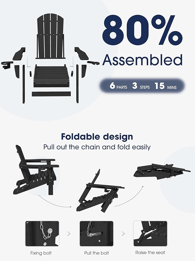 - Quick and Simple Assembly: Enjoy the convenience of a partially pre-assembled chair. Our adirondack chairs comes with 6 parts, clear instructions, and hardware. Assembly requires just 5 steps and 15 minutes.