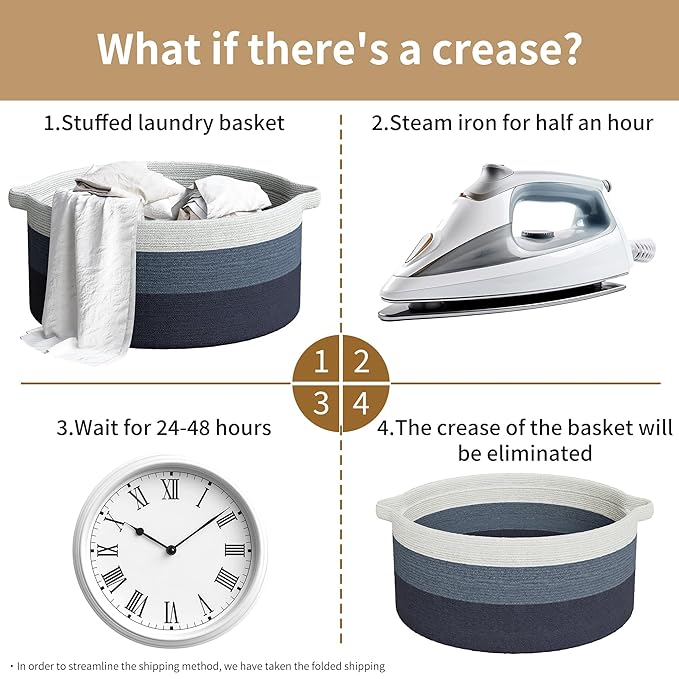 - Note: Blankets basket comes folded and may have creases. Fully fill the rope basket with towels or clothes and wait for 1-2 days will help reshape the blanket basket. Alternatively, use steam or ironing for a quick reshape the laundry basket