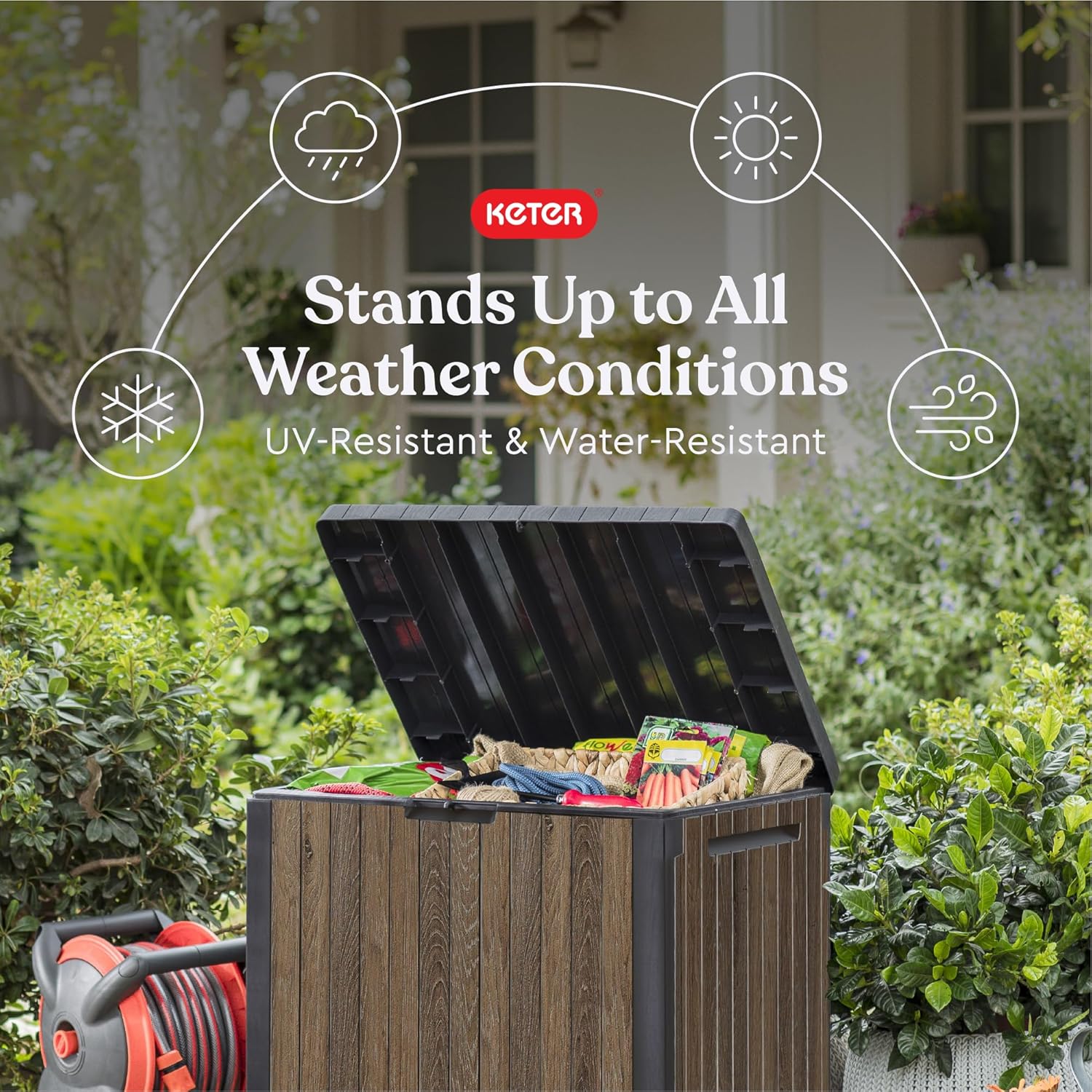 Keter Signature Everwood 30 Gallon Resin Outdoor Storage Box and Patio Furniture Side Table for Pool and Garden Accessories, Walnut