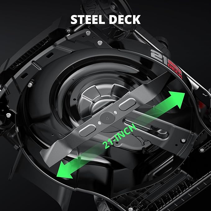 - DURABLE 21" STEEL DECK FOR FASTER RESULTS: The reinforced 21-inch steel cutting deck on this lawnmower is built to handle tough mowing jobs, delivering smooth, even cuts. Itโs an excellent match for those who want to finish faster with a high-efficiency gas powered lawn mower