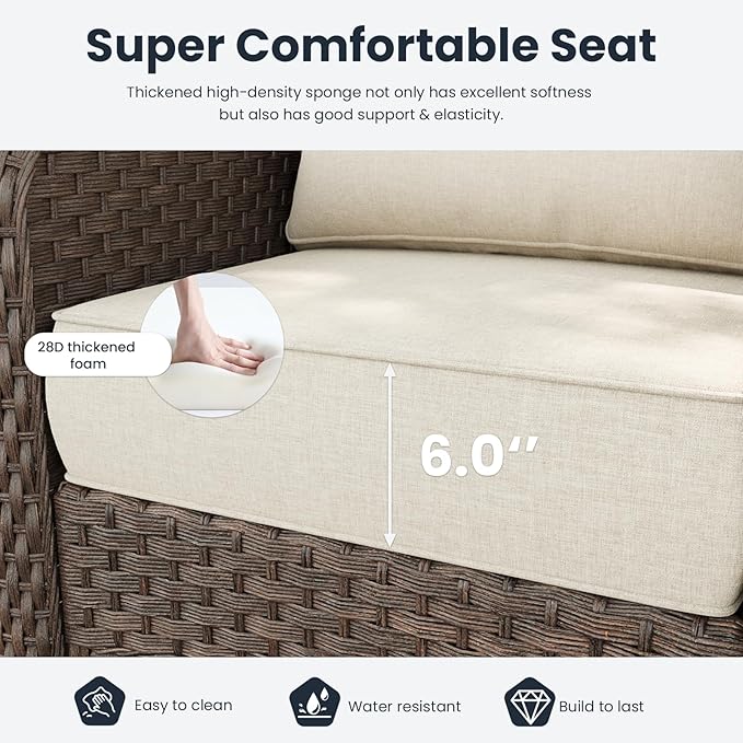 - RELIABLE OUTDOOR FABRIC: Cushion features 6-inch-thick, 28D high-density sponge, giving it perfect balance of softness & support. It provides outstanding support and elasticity by evenly distributing your body weight, which effectively soothes and reduces fatigue. You'll enjoy ultimate comfort, even when sitting for extended periods.